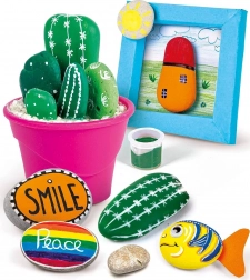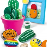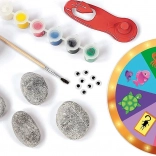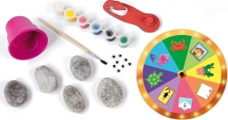 Táto kreatívna sada ponúka všetko, čo deti potrebujú na tvorbu farebných kamienkov – od rôzne veľkých kameňov cez temperové farby až po nalepovacie oči. Súčasťou je aj zábavné koliesko s výzvami, ktoré deťom napovie, aké motívy vyskúšať a ako skladať malé kamenné kompozície.