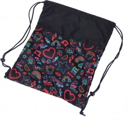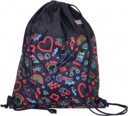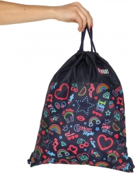 Štýlový a praktický vak na obuv BAMBINO s neónovou potlačou na čiernom podklade je ideálny do školy, na telesnú výchovu aj voľný čas. Vďaka dvojitým bočným šnúrkam ho môžete pohodlne nosiť v ruke, na pleci alebo ako batoh. Kompaktné rozmery 34 × 43 cm poskytujú dostatok miesta na topánky či cvičebný úbor.