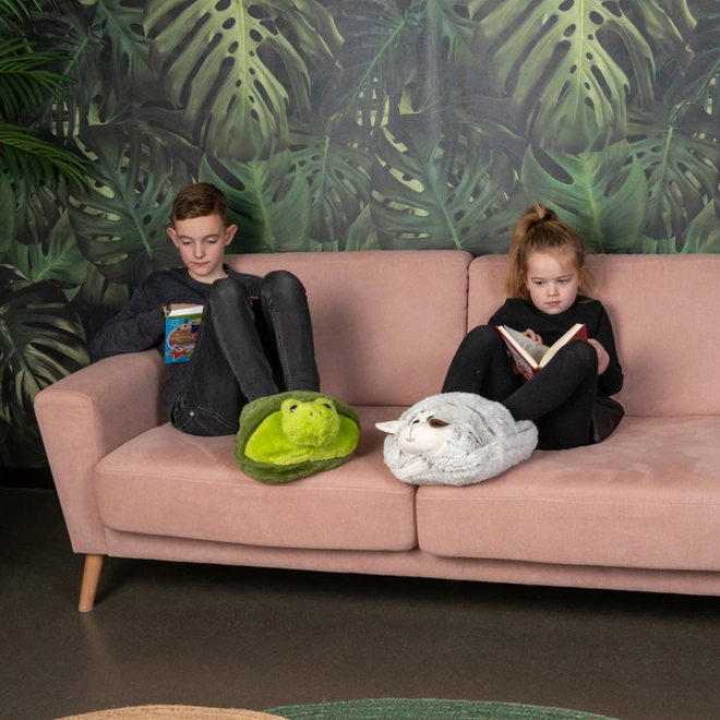 Obria domáca papuča v tvare korytnačky je navrhnutá na maximálny komfort pri sedení a ležaní. Vďaka super mäkkej výplni a útulnému vnútru udržiava nohy v teple bez elektriny a bez rizika popálenia. Je ideálna na sledovanie televízie, čítanie, hraníe hier či prácu na notebooku.