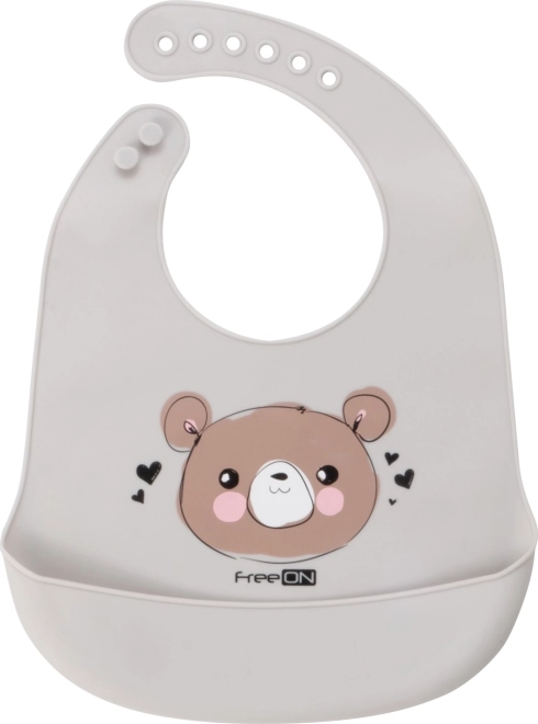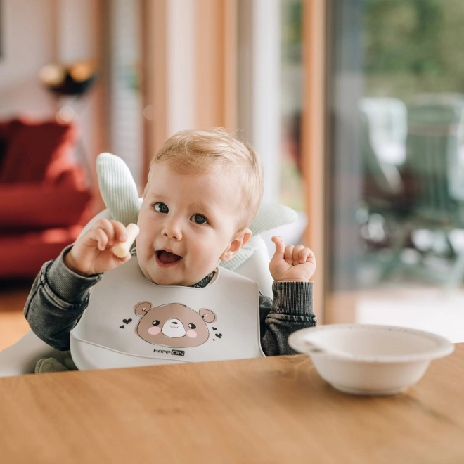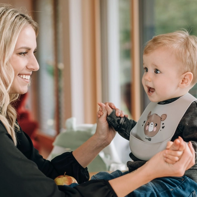 Čaká vás pri každom kŕmení boj so škvrnami? Tento silikónový podbradník s motívom macka vám pomôže! Je mäkký, ľahký a pohodlný, preto ho vaše dieťa znesie aj pri dlhších sedeniach pri stole. Vďaka nastaviteľnému zapínaniu na krku bude podbradník rásť spolu s vaším dieťaťom. Veľká zberná kapsa zabezpečí, že zvyšky jedla skončia tam, kde majú, a nie na oblečení vášho dieťaťa.