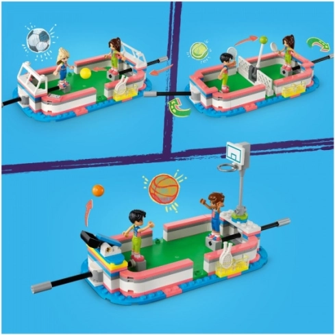 LEGO Friends športové centrum prináša deťom nekonečné možnosti hier. Modulárne ihrisko ľahko premeníte z futbalu na tenis či basketbal, nechýba tabuľa skóre, bezpečné úložisko lôpt ani detailne vybavené zázemie – posilňovňa, lezecká stena a šatňa. S aplikáciou LEGO Builder je stavanie intuitívne vďaka približovaniu, otáčaniu modelu a sledovaniu postupu.