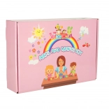 Obsah balenia zahŕňa okrem iného: chlpaté a trblietavé drôtiky, drevené špachtle, farebné papieriky, sady nálepiek, pohyblivé a farebné očká, pompony, pierka, koráliky vrátane písmen, plastovú šnúrku na navliekanie aj bezpečné nožnice. Všetko je uložené v peknej ružovej krabici, ktorá je ideálna aj ako darček.