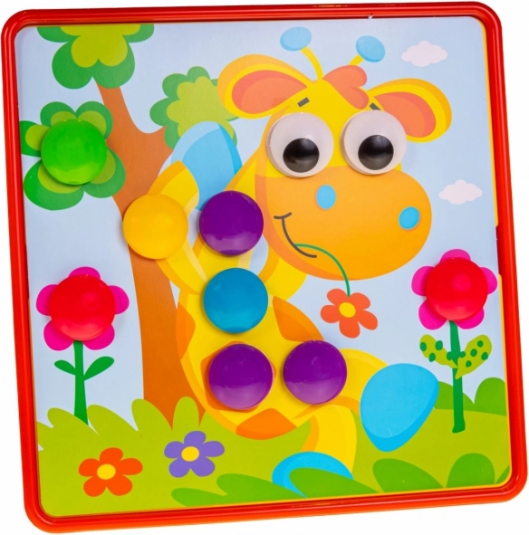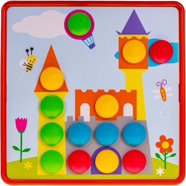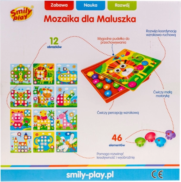Začnite kreatívnu zábavu s mozaikou s kolíčkami: vkladajte farebné dieliky do otvorov podľa predlôh a farebných obrysov. Hračka rozvíja jemnú motoriku, učí farby a koordináciu oko‑ruka, nevyžaduje žiadne batérie a je vyrobená z odolných, netoxických materiálov. Súčasťou je praktický úložný box a 12 predlôh pre rýchly štart.