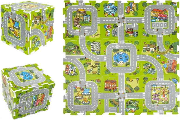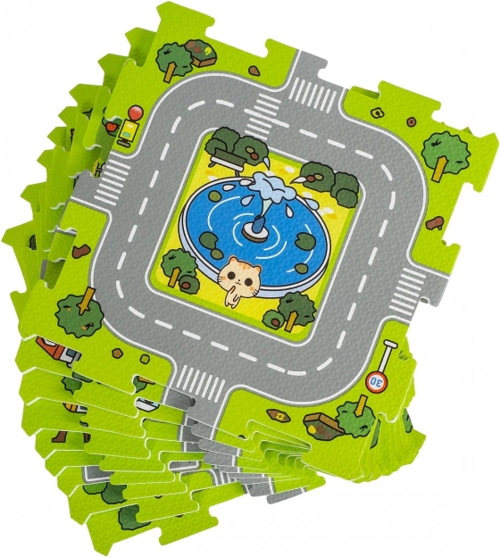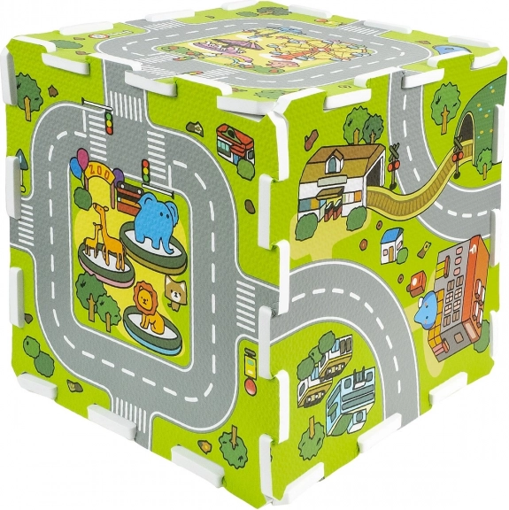 Táto univerzálna penová podložka slúži ako pohodlný koberček aj ako skladacie puzzle s motívom ulíc a budov. Deti môžu bezpečne jazdiť s autíčkami, plánovať trasy a pritom si precvičovať jemnú motoriku a logické myslenie. Jednostranná potlač je jasná a pútavá, povrch je príjemný na dotyk a ľahko sa udržiava.