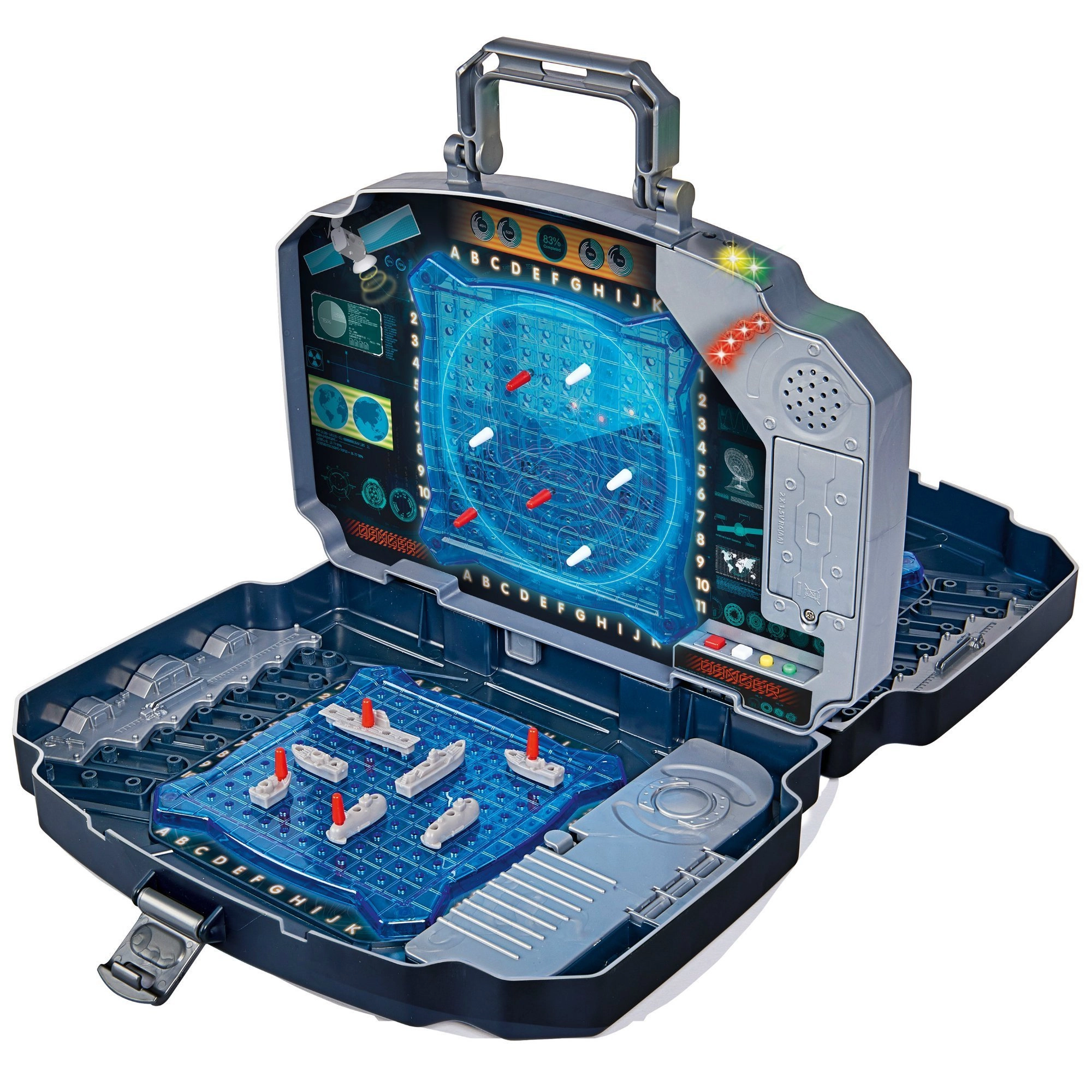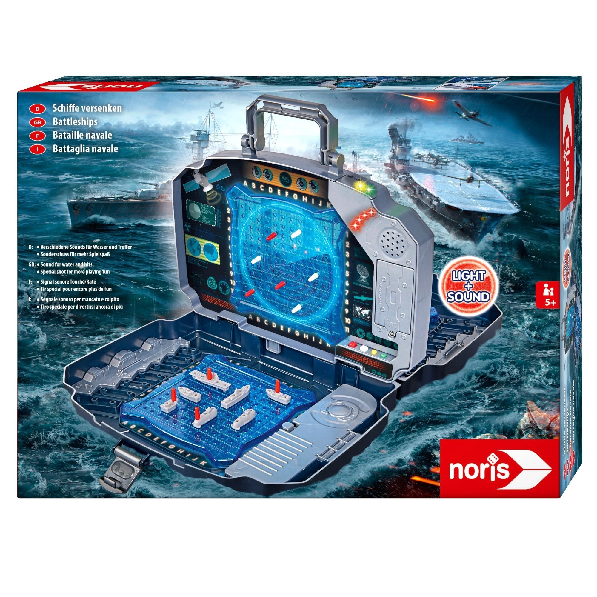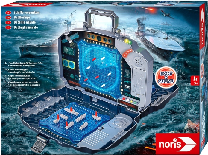 Užite si klasickú hru Námorná bitka v modernom prevedení. Pevný grafitový kufrík ukrýva dve modré hracie mriežky na rozmiestnenie lodí a stredový panel na označovanie striel na súpera. Integrované svetelné a zvukové efekty jasne oznámia zásah aj minutie – hra je tak prehľadná, napínavá a zábavná pre celú rodinu.