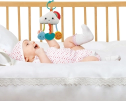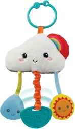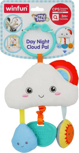 Závesný mráčik Deň a noc je hebká senzorická hračka, ktorá rozvíja hmat, sluch aj zrak. Farebné textúry, šuštivé a hrkajúce časti a jemné vibrácie po potiahnutí za pútko udržiavajú pozornosť bábätka a podporujú jeho prirodzenú zvedavosť. Obojstranný motív – veselý denný mráčik a pokojná nočná tvár – pomáha vytvárať upokojujúcu rutinu počas dňa aj pred spaním.