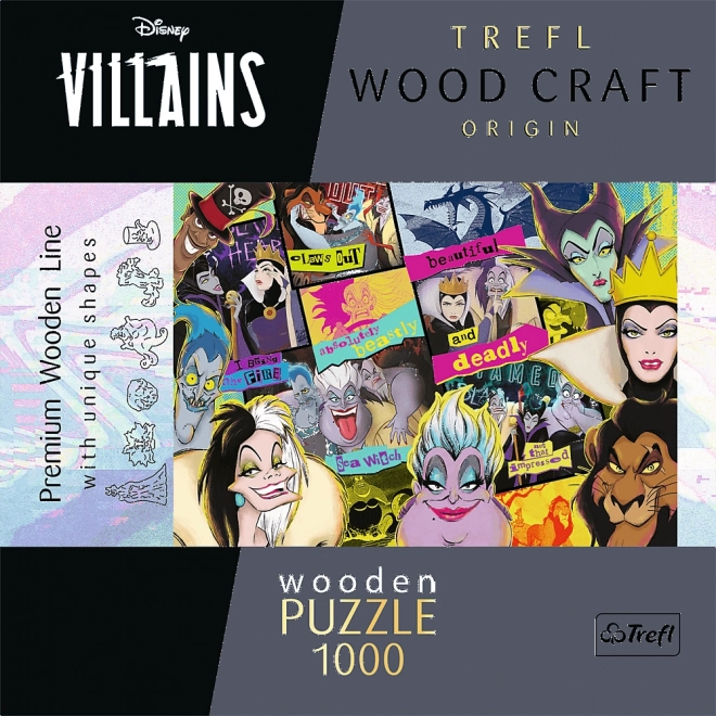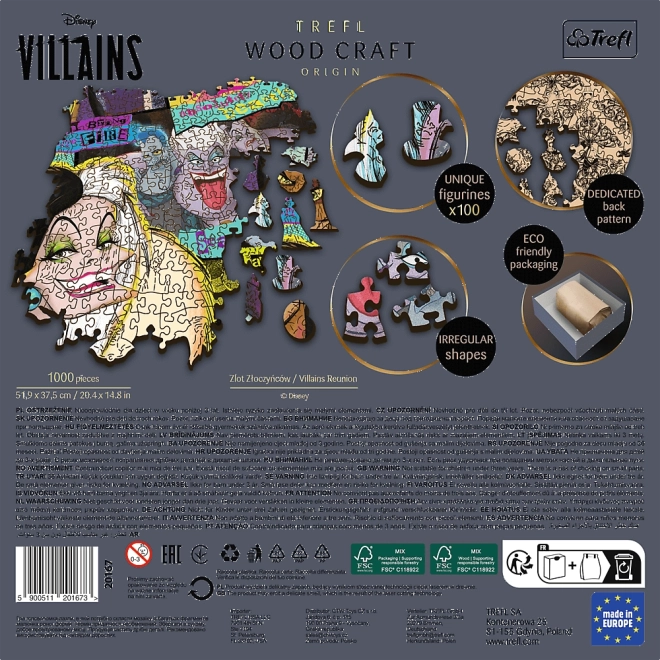Objavte prémiové drevené obojstranné puzzle TREFL z radu Wood Craft Origin s motívom Disney: Stretnutie záporákov. Vďaka laserovo presnému spracovaniu do seba dieliky dokonale zapadajú, okraje sú hladké a skladačka ponúka nezameniteľný zážitok pre milovníkov puzzle aj sveta Disney. Čaká na vás 100 jedinečne tvarovaných dielikov, obojstranná potlač a ekologické balenie bez plastu.