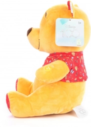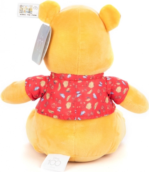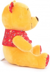 Macko Pú je vyrobený z mäkkého žltého plyšu a nosí červené tričko s dekoratívnym vzorom, čo z neho robí ideálneho spoločníka na maznanie.