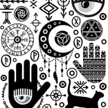 - Mystické symboly (oko, mesiac, mačka, ruky, nápisy)