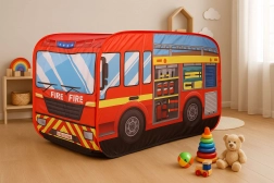 Štýlový detský stan v tvare hasičského auta prinesie hodiny zábavy doma aj na záhrade. Ponúka rýchle pop-up rozloženie, vodoodolnú podlahu, zadný vstup a otváraciu strechu pre ešte kreatívnejšie hranie. Ľahká konštrukcia z polyesteru sa ľahko prenáša a farebné grafiky hasičov nadchnú každého malého hrdinu.