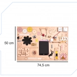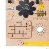 Magnetická kresliaca tabuľka, tabuľa na kriedu, ozubené kolieska a labyrint rozvíjajú fantáziu, zrakové vnímanie aj logické myslenie.