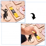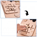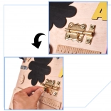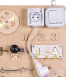 Vypínač svetla, zásuvka so zástrčkou, zámky a západky učia deti príčinu a následok aj praktické zručnosti v bezpečnom prevedení.