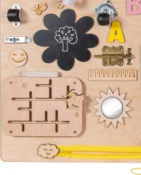 Magnetická kresliaca tabuľka, tabuľa na kriedu, ozubené kolieska a labyrint rozvíjajú fantáziu, zrakové vnímanie aj logické myslenie.