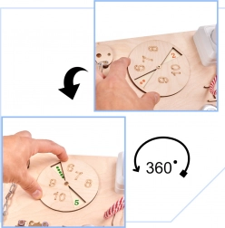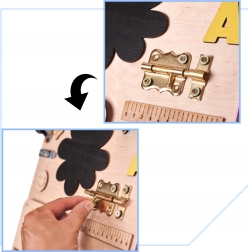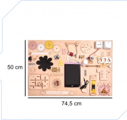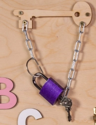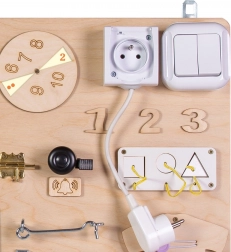 Vypínač svetla, zásuvka so zástrčkou, zámky a západky učia deti príčinu a následok aj praktické zručnosti v bezpečnom prevedení.