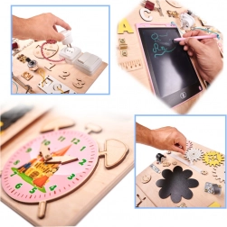 Súčasťou je pestrá paleta aktivít: elektronická magnetická kresliaca tabuľka s perom, farebné ozubené kolieska, zips, cyklistický zvonček, rôzne typy západiek a háčikov, šnurovacia topánka, košeľa s gombíkmi, drevené čísla a písmená, koliesko s číslami, labyrint s pohyblivým žralokom, tabuľa na kriedu v tvare lode, mierka, vypínač svetla, zásuvka so zástrčkou, suchý zips, bezpečné zrkadielko v rakete, zámok s kľúčikmi a popruh s prackou.
