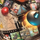 Puzzle oslavuje Disney postavy cez filmové motívy a objekty ako hodiny a jablká.