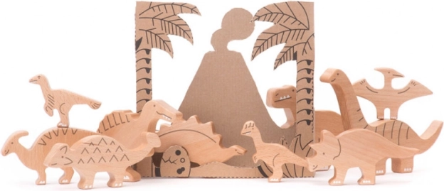 Balenie súpravy je navrhnuté tak, aby mohlo fungovať ako kulisy pre kreatívne hry. Rozrezaním kartónu pozdĺž vyznačených čiar vytvoríte scenériu z praveku. Hračky sú vyrobené z bukového dreva, ktoré je známe svojou životnosťou a ekologickou spôsobilosťou. Hravosť a vzdelávanie idú ruka v ruke skrze prírodné materiály.