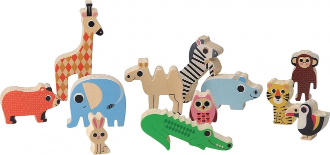 Hra obsahuje pestrú kolekciu 12 drevených zvieratok, ktoré deti môžu skladať a vyvážiť na základe.