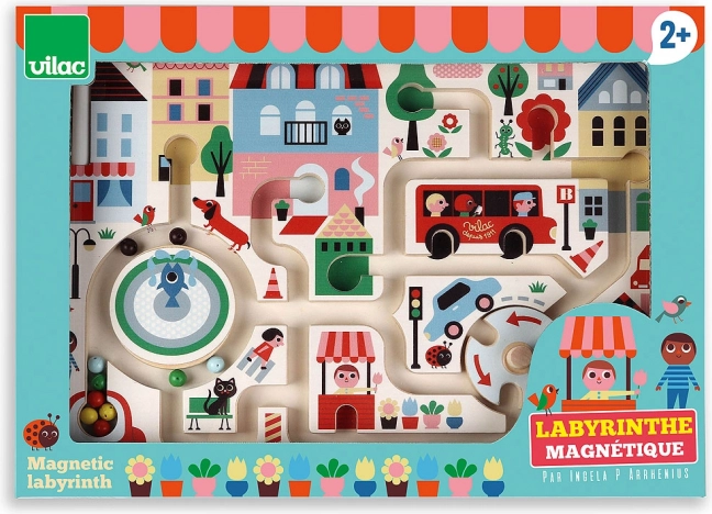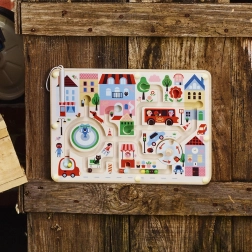 Magnetický labyrint podporuje detskú predstavivosť a kreatívne myslenie cez vedenie guličiek mestom.