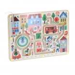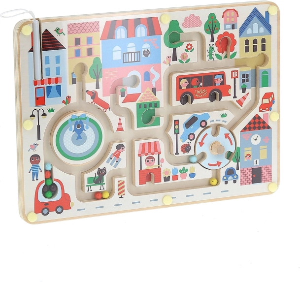 Vstúpte do sveta plného farieb a fantázie s hrou Magnetický labyrint Moje mesto. Použite magnetické pero na vedenie farebných guličiek mestom a rozvíjajte tak jemnú motoriku svojho dieťaťa. Drevená hračka, ktorá nie je len nástrojom pre hravé učenie, ale tiež pomáha pri rozširovaní detskej slovnej zásoby.