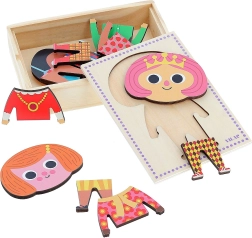 Obliekacie puzzle Jade so 6 rôznymi outfitmi umožňuje deťom vytvárať nespočetné kombinácie a rozvíjať svoju kreativitu a motoriku. Obsahuje 18 dielikov v praktickej krabičke.