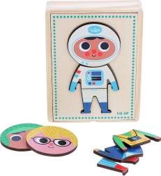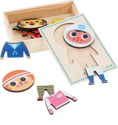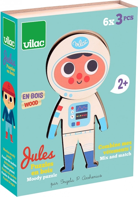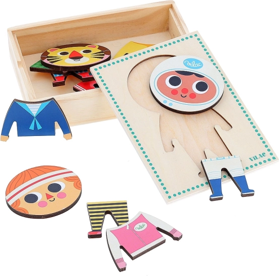 Vilac obliekačka puzzle Jules je drevená hračka, ktorá je ideálna pre rozvoj motoriky, postrehu a kreativity detí. Obsahuje 18 dielikov, ktoré umožňujú vytvoriť celkom 6 základných outfitov. Deti môžu mixovať jednotlivé dieliky a vytvárať tak nekonečné množstvo kombinácií: