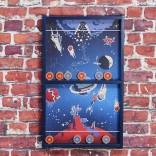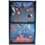 Vďaka vymeniteľnému stredu si ľahko zvolíte náročnosť: klasický jeden centrálny otvor na tréning presnosti alebo náročnejšia doska s dvomi mimo stredovými otvormi pre skúsených strelcov. Robustná drevená konštrukcia, plynulý sklz pukov a retro vesmírna grafika zaručujú dlhotrvajúcu zábavu aj štýlový vzhľad hracej plochy.