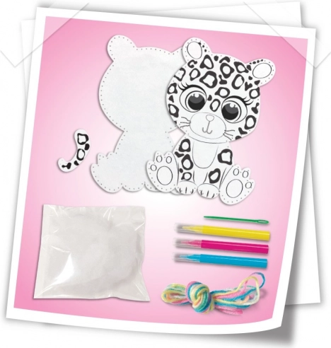 Kreatívna sada na šitie a vyfarbovanie pantera. Ušite a ozdobte plyšáka 20 × 16 cm. Filcové diely, výplň, nite, plastová ihla, 3 fixky a návod.