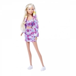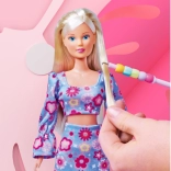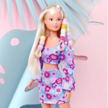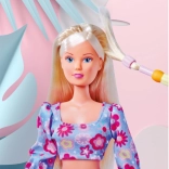 Bábika Steffi v kvetinovom dvojdielnom outfite, s háčikom na navliekanie korálikov na prameň vlasov, farebnými korálikmi, gumičkou na fixáciu a hrebeňom s úložným priestorom. Výška bábiky 29 cm.