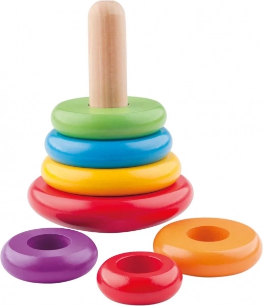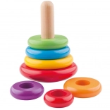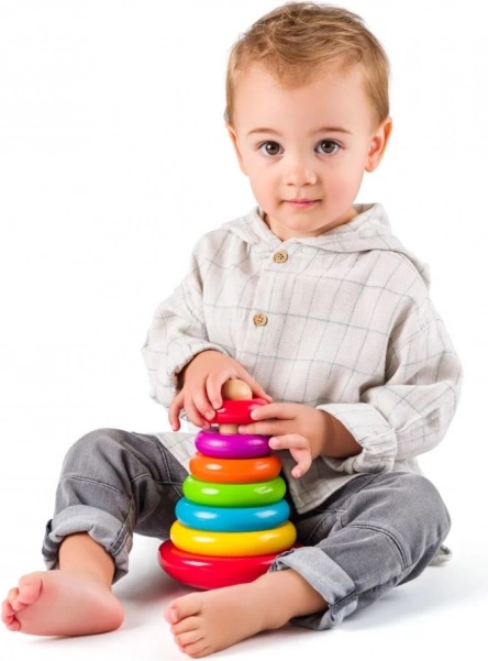 Táto hračka spája dva výborné spôsoby zábavy – ako pyramída a ako káča. Deti navliekajú farebné drevené krúžky na tyčku od najväčšieho po najmenší a zároveň rozvíjajú kreativitu a jemnú motoriku. Okrem toho možno hračku roztočiť ako káču, čo pridáva ďalšiu úroveň zábavy.
