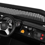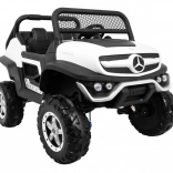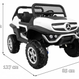 Mercedes‑Benz UNIMOG je ikonické off‑road autíčko pre dve deti so sedadlom z ekokože a bezpečnostnými pásmi. Vďaka prepínateľnému pohonu 2×4 / 4×4, veľkým EVA kolesám (Ø 37 × 14 cm) a zadným tlmičom s reguláciou zvládne záhradu, dlažbu aj ľahký terén. Plynulý rozjazd, jazdné smery vpred/vzad a vysoká prejazdová svetlá výška 27 cm zaručujú istotu a pohodlie.