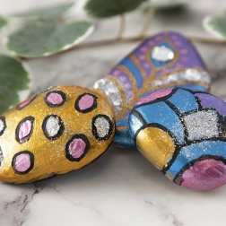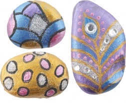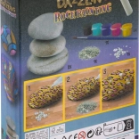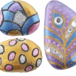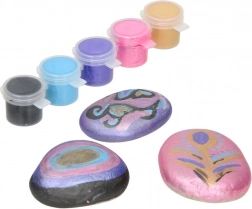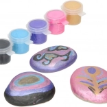 Sada obsahuje 3 prírodné kamene, štetec, 5 kelímkov farieb, lepidlo, trblietky a zdobiace kamienky – môžete začať tvoriť ihneď.