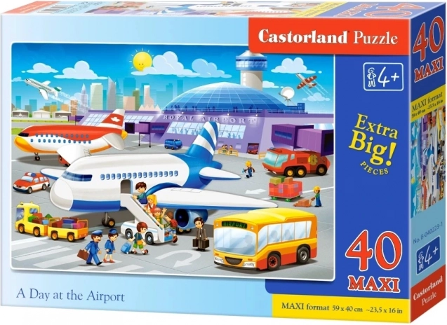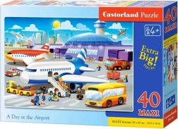 Farebné maxi puzzle pre deti s motívom DEŇ NA LETISKU: 40 veľkých dielikov na ľahké skladanie, po zložení rozmer 59 × 40 cm. Kvalitné spracovanie Castorland rozvíja jemnú motoriku, sústredenie a predstavivosť. Vhodné od 4 rokov.