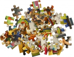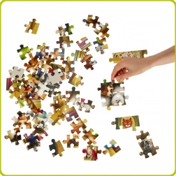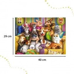 Pestrofarebná scéna so psami, mačkami a papagájom motivuje deti k skladaniu a prináša radosť z hotového obrázka.