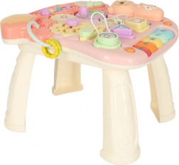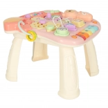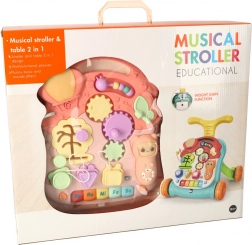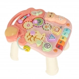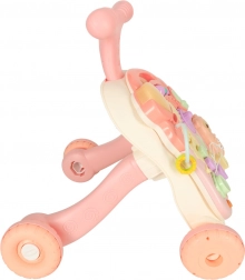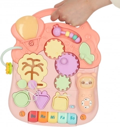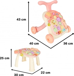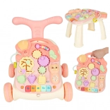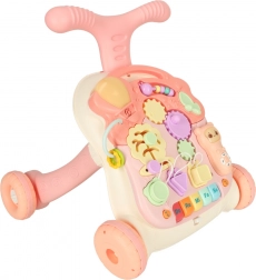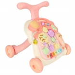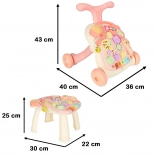 Táto multifunkčná hračka 3v1 sa prispôsobí vývoju dieťaťa: najprv poslúži ako závesná interaktívna tabuľa na hranie v pokoji, potom ako stolík s aktivitami pre zvedavé státie a nakoniec ako chodítko na bezpečné prvé krôčiky. Pastelová ružová farebnosť a pestré prvky lákajú k objavovaniu, tlačidlá prehrávajú melódie a zvuky a rozmanité aktivity rozvíjajú zručnosti dieťaťa.