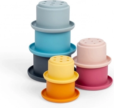 Bezplastový 100 % silikón je mäkký do detských rúk, zároveň veľmi odolný voči teplotám a škvrnám. Ľahko sa udržiava – stačí teplá voda a jemné mydlo alebo umývačka. Hra s kelímkami podporuje motorické zručnosti, senzorické vnímanie, balans a prvé logické myslenie.