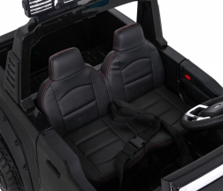 Bezpečnosť a pohodlie sú na prvom mieste: sedadlá z eko kože s bezpečnostnými pásmi, trojstupňové nastavenie sedadiel a diaľkový ovládač 2,4 GHz s funkciou STOP dávajú rodičom plnú kontrolu. Bohatá svetelná výbava (LED, podsvietené podvozkové prvky, zadný oblúk aj kabína) a audio panel s MP3/AUX/USB vytvoria autentický zážitok ako v skutočnom vozidle.