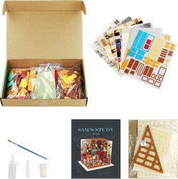 Všetko potrebné je súčasťou balenia – od predrezaných dielov z preglejky cez papierové a látkové prvky až po lepidlo, farby a štetec. Stavba zahŕňa maľovanie a lepenie, prácu s drobnými detailmi a trpezlivé skladanie, čo z nej robí ideálny projekt na pokojný víkend.