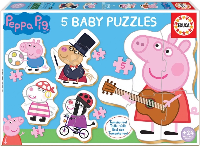 Educa puzzle Prasiatko Peppa sú špeciálne navrhnuté puzzle pre deti od 24 mesiacov. Päť progresívnych puzzle s 3 až 5 dielikmi podporuje rozvoj detského psychomotorického vývoja.