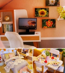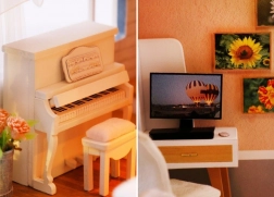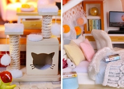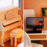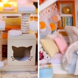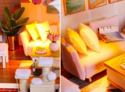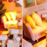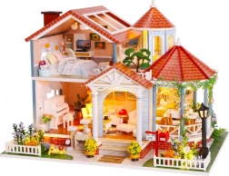Model je vyrobený z kombinácie drevena, papiera a látky, vďaka čomu pôsobí realisticky a kvalitne. Interiér zdobia miniatúrny nábytok a dekorácie, ktoré podčiarkujú atmosféru malého domova. LED svetlá (napájané 2× AAA, nie sú súčasťou) dodajú scenérii živost a večer vytvoria príjemnú náladu.