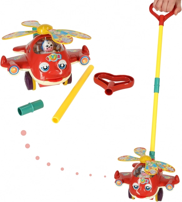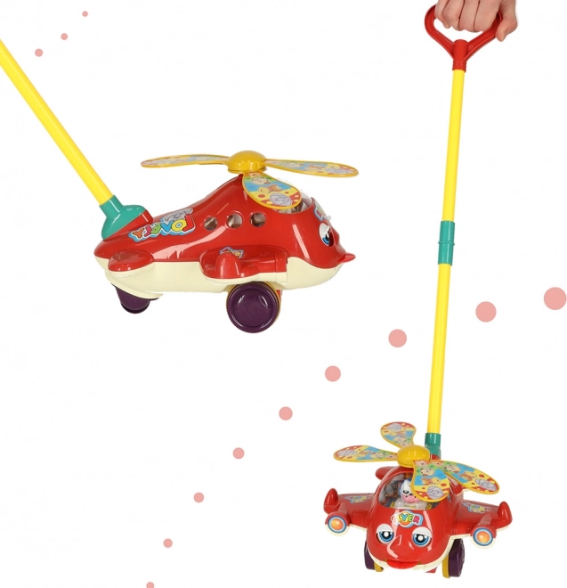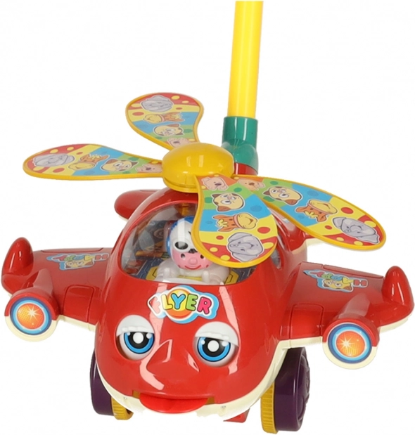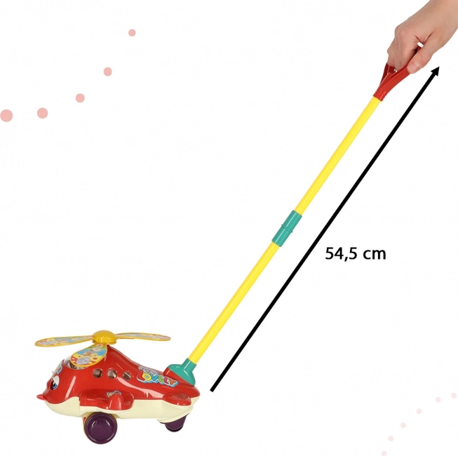 Dizajn hračky zahŕňa živé farby a veselé motívy, vďaka čomu priťahuje detskú pozornosť. Červený vrtuľník pri pohybe točí vrtuľami a vydáva zvuk zvončeka. Oporná tyč je navrhnutá tak, aby zodpovedala výške dieťaťa a možno ju jednoducho sklopiť pre pohodlné skladovanie alebo prepravu.