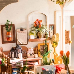 Miniatúrne kvety, nábytok, vankúše a doplnky vytvárajú vernú atmosféru záhradnej terasy – ideálne ako štýlová domáca dekorácia.