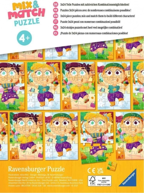 Objavte zábavné skladanie s edíciou Mix & Match, kde sa fantázii medze nekladú. V jednej krabičke nájdete tri kvalitné puzzle s 24 dielikmi, ktoré možno skladať štandardne podľa obrázkov, alebo ľubovoľne miešať a vytvárať nové, vtipné postavy vo farebných šatách.