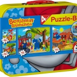 Deti budú mať radosť z praktického plechového kufríka, v ktorom sa skrývajú štyri rôznorodé puzzle s populárnym slonom Benjaminom Kvietkom. Skvelý spôsob, ako rozvíjať detské schopnosti.