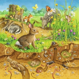Toto puzzle ponúka pohľad na lesné zvieratá a ich správanie, vrátane králikov, líšok a diviakov okolo ich prirodzených nor.