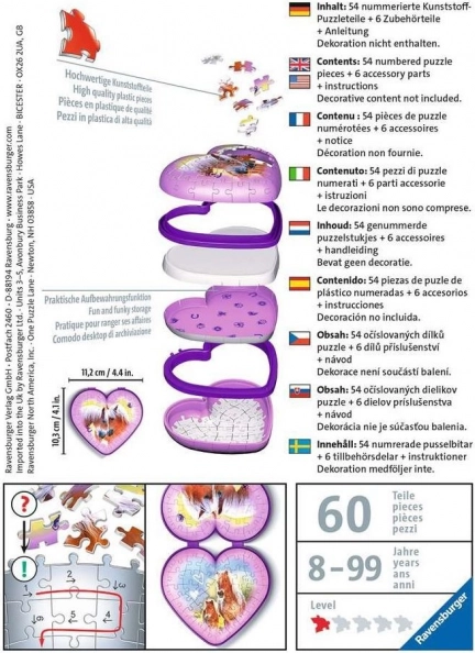 Objavte kúzlo 3D puzzle RAVENSBURGER: z presne vyrobených, zakrivených a ohybných dielikov zostavíte pôsobivú šperkovnicu v tvare srdca s nežným motívom koní. Konštrukcia je stabilná, drží pevne bez lepidla a po zostavení slúži ako funkčná a krásna dekorácia do detskej izby.