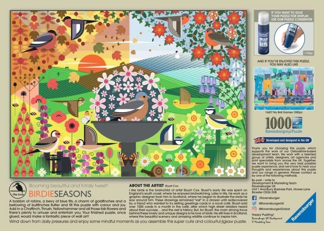 Ravensburger „I Like Birds – Birdie Seasons“ je úžasné 1000-dielikové puzzle, ktoré prináša do vášho domova kúsok prírody. Ilustrácia zahŕňa druhy vtákov ako čížik, drozd, strnád a sýkorka, ktoré sú zvýraznené sezónnymi kvetmi. Tento umelecký kúsok je dielom Stuarta Coxa, ktorý je známy svojou vášňou pre prírodu a detailným dizajnom.