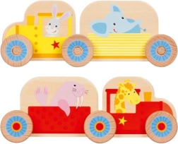Zostavte si svoj prvý vláčik s dvomi lokomotívami a vagónikmi, ktorý vezie zvieratká na výlet. Bezpečná hračka z masívneho dreva, ideálna do detských rúk.