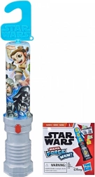 - 4 mini figúrky, 1 list samolepiek, obal v tvare mikro svetelného meča