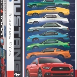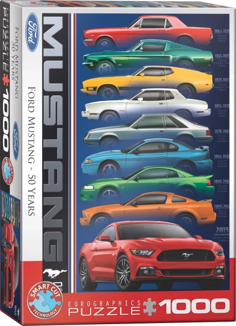 Oslávte legendu medzi vozidlami s puzzle EUROGRAPHICS k 50. výročiu Ford Mustang. Čaká na vás 1000 dielikov, unikátny nepravidelný výsek pre vyššiu náročnosť a rozmer po zložení 48,89 × 67,63 cm. Texty na obrázku sú v angličtine.